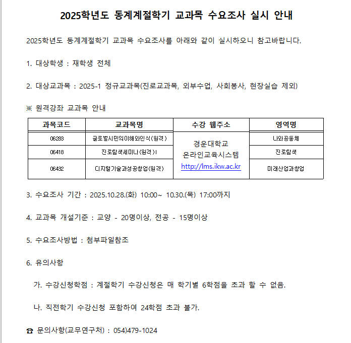 [교무연구처] 2025학년도 동계계절학기 교과목 수요조사 실시 안내